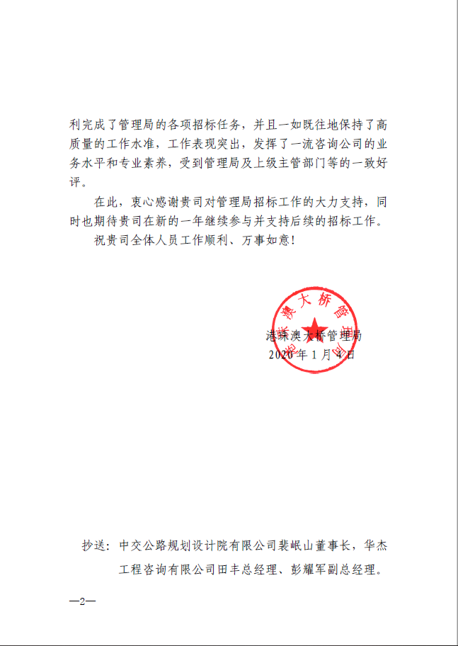 近日,公司收到业主单位港珠澳大桥管理局发来的感谢信。在港珠澳大桥主体工程建设期,公司提供了优质的项目管理和招标咨询服务;大桥进入运营期后,公司继续为大桥防洪影响后评估、东人工岛旅游(蓝海豚岛)及配套设施开发总体策划及概念设计、机电日常养护等项目提供了全过程的招标代理服务。华杰公司招标三部团队以高度负责、锐意进取、求真务实的工作态度,一如既往地保持了高质量的工作水准,获得了业主的表扬。