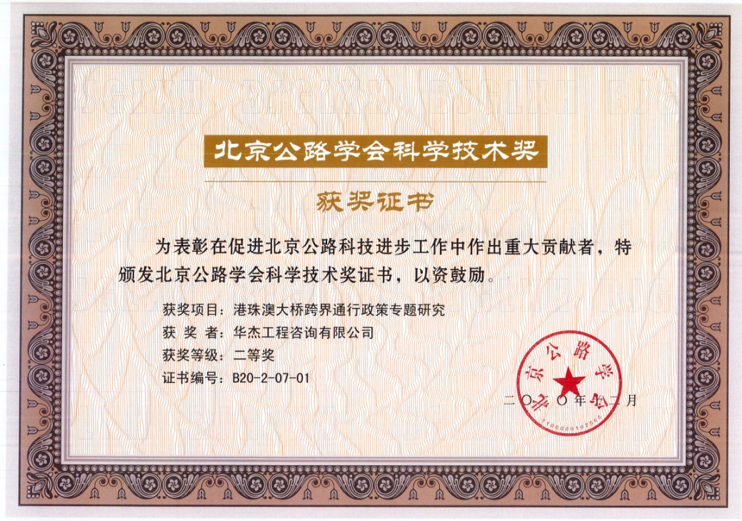 4月20日,2020年度北京公路学会科学技术奖颁奖会在京召开。华杰公司申报的《港珠澳大桥跨界通行政策专题研究》《新型城镇化下普通国省干线公路功能分类关键技术研究》两个项目,分别荣获2020年度北京公路学会科学技术奖二、三等奖。